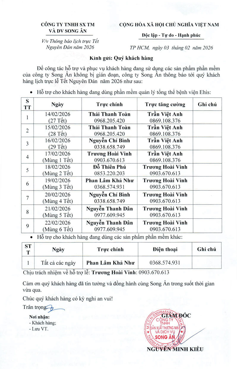 Để công tác hỗ trợ và phục vụ khách hàng đang sử dụng các sản phẩm phần mềm của công ty Song Ân không bị gián đoạn, công ty Song Ân thông báo tới quý khách hàng lịch trực Tết Nguyên Đán 2025 như sau: